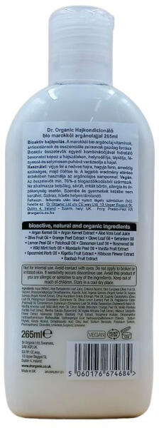 A marokkói bio argán olaj vitaminok, antioxidánsok és esszenciális zsírsavak fantasztikus forrása. Hidratáló és regeneráló bevonatot képez a hajszálakon, emellett mélyen behatolva a hajszálak rostjai közé. A hatást fokozza az argán sampon használatával. 265 ml-es hajkondicionáló; Dr. Organic termék.