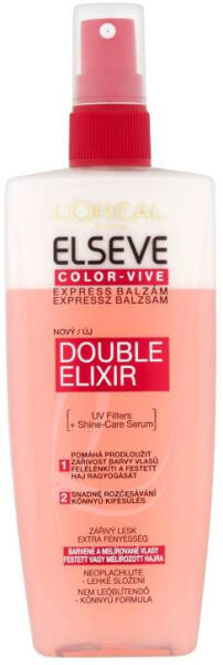 Védje hajszínét a L'Oréal Paris Elseve Color-Vive Double Elixir expressz, spray kiszerelésű hajápolóval, mely UV-szűrőket és Shine-Care szérumot tartalmaz, hogy a megérdemelt hidratálást és ápolást biztosítsa haja számára. Használata hosszan tartó élénk színt és ellenállhatatlan puhaságot eredményez.