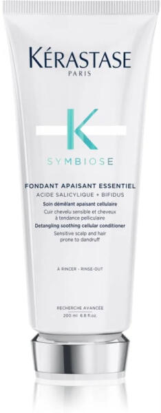 A Kerastase Symbiose Fondant Apaisant Essentiel Nyugtató Balzsam 200ml csökkenti a fejbőr érzékenységét és hidratálja a hajat, anélkül, hogy elnehezítené. . Jellemzői:. Szilikon- és szulfátmentes formula. Nyugtatja a fejbőrt és megszünteti a diszkomfortot. Segíti a könnyű kifésülést, nem nehezíti el a hajat. Salicilsavval és Bifidusszal a fejbőr egészségéért. Használati utasítás: Vidd fel a törölközőszáraz hajra és masszírozd be a fejbőrbe, a haj hosszába és végeibe. . Hagyd hatni 2-3 percig, majd öblítsd le alaposan.