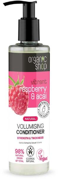 Az Organic Shop Vibrant Raspberry & Acai Volumising Conditioner ideális vékonyszálú, tartás nélküli hajra. Volument, erőt és sűrűséget ad a hajnak. Az összetétel organikus málna és organikus acai tartalmával gazdagított, amelyek fényt kölcsönöznek a hajnak, miközben finoman tisztítják és erősítik azt.